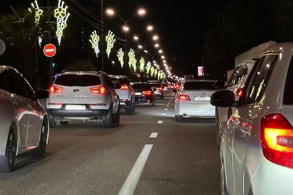 В Сочи с ночи стоит пробка из-за огромной лужи в АдлереЖители окрестных домов — без воды, трасса — без движения